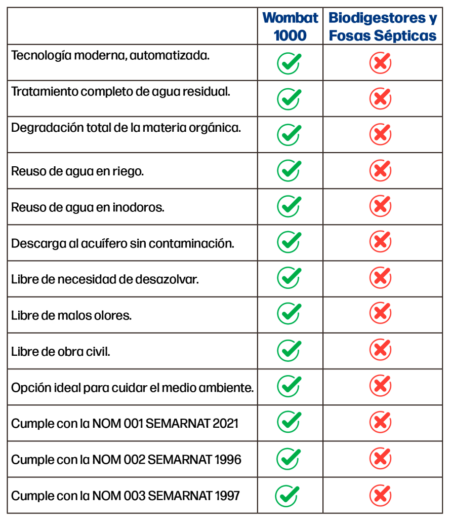El Wombat 1000 utiliza un sistema biológico aerobio de última generación, basado en la tecnología MBBR (Mobile Bed Biofilm Reactor, o Reactor de Biopelícula Fija de Lecho Móvil).